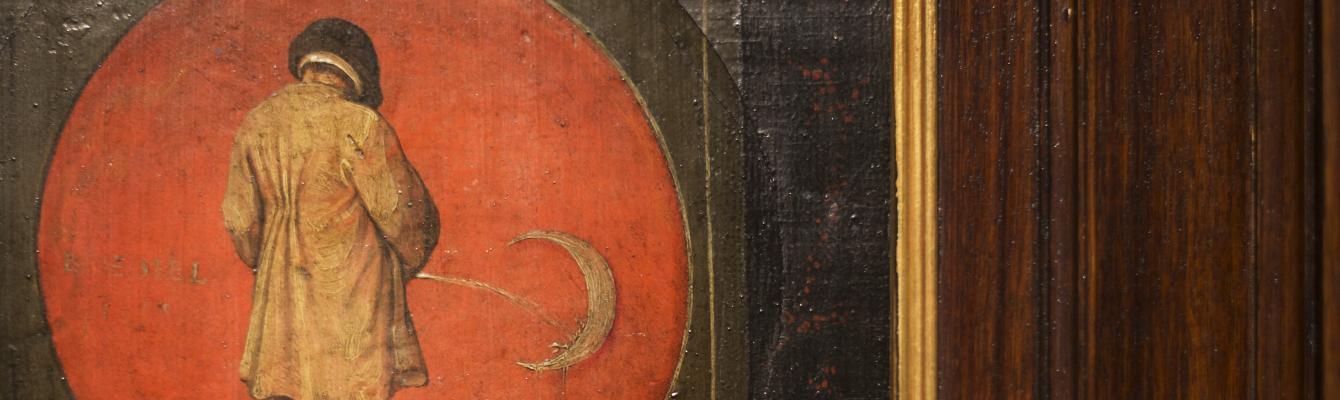 At one time they were twelve separate round medallions. At an early stage, they were turned into a single panel, and a text was added. Each one was individually painted by Pieter Bruegel himself, and shows a single figure in action.