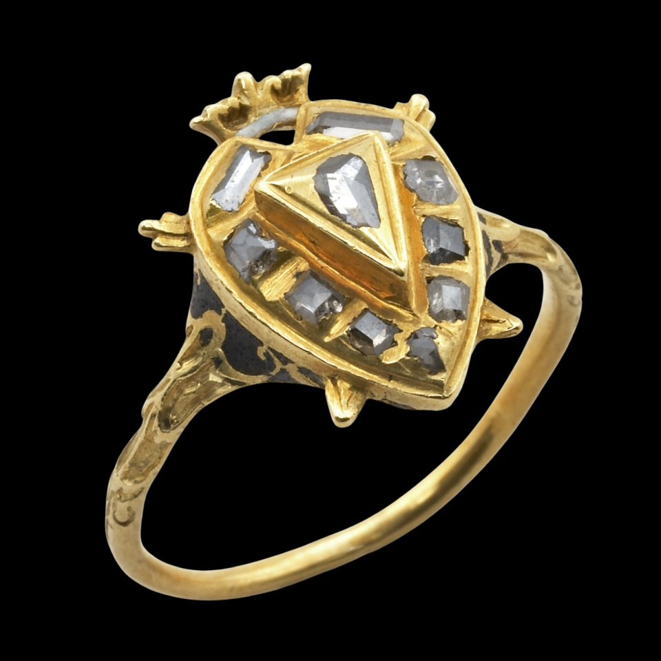 De 17e-eeuwse Liefdesring heeft de vorm van een met gekruiste pijlen doorboord hart, waarin rondom een driehoekige facetsteen met negen diamanten werden gezet. Op het kroontje zijn er nog sporen van email. Het doorboorde hart verwijst ontegensprekelijk naar de romantische liefde, de kroon naar loyaliteit.