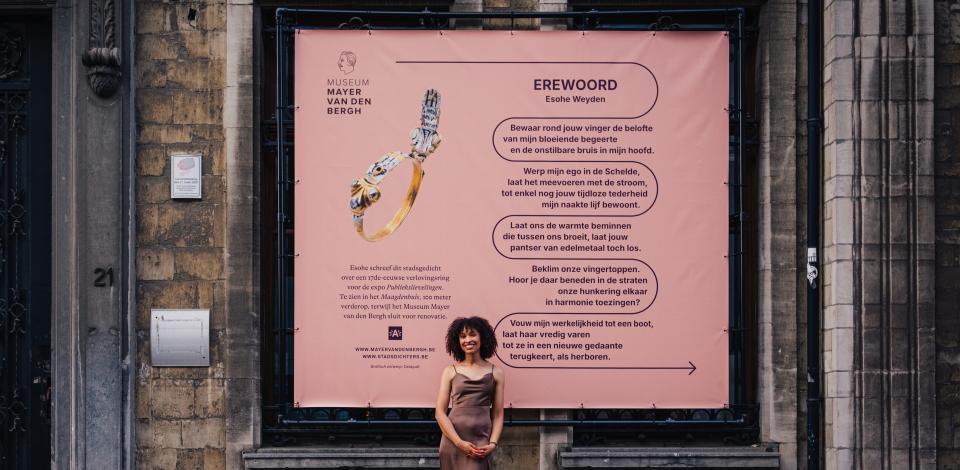 Ook in de expo Publiekslievelingen. Een intieme blik op meesterwerken in Museum Mayer van den Bergh kan je een prachtige ring bewonderen. Op deze gouden verlovingsring uit de 17e eeuw kan je één van de twee handen, die een diamant draagt, openklappen. Hierdoor zie je aan de binnenkant de woorden 'amour pour amour' verschijnen. Deze ring is de publiekslieveling van stadsdichter en schrijfster Esohe Weyden. Hij inspireerde haar tot het schrijven van een stadsgedicht, dat je kan bewonderen aan de gevel van Museum Mayer van den Bergh. Lees waarom de ring Esohe zo raakte.