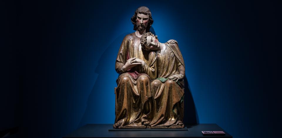 Dit monumentale beeld is een absoluut pronkstuk, dat even voor 1300 gesneden werd door meester Heinrich von Konstanz voor het dominicanessenklooster in Sankt Katharinenthal in Zwitserland. Het levensgrote beeld van Christus en zijn jonge apostel Johannes toont een bijzonder innig moment. Meester en leerling – God en mens – zijn als het ware met elkaar versmolten. Het plooienspel van de gewaden versterkt die eenheid nog.