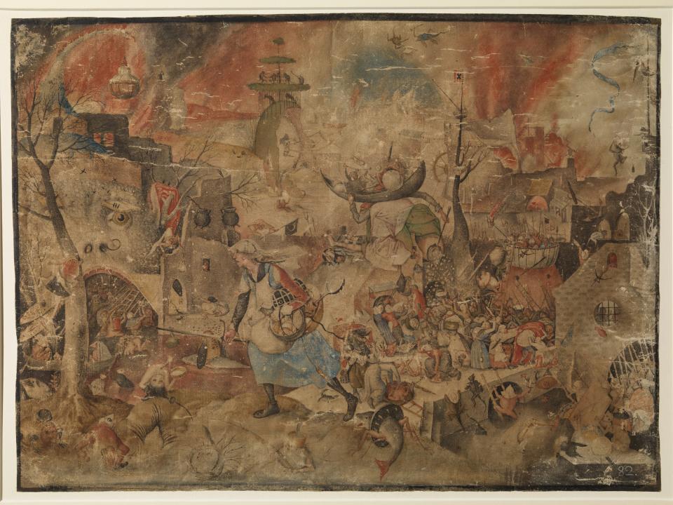 L’équipe pluridisciplinaire a mis au jour quelques découvertes qui actualisent les travaux de recherche effectués en 2011 et 2012. L’utilisation de techniques nouvelles et affinées lui a en effet permis de révéler et d’étudier une à une les couches de peinture. Les cartes de diffusion macro-XRF de cuivre et carbonate de calcium montrent que Breughel n’a pas tracé le mot Dul sur le panneau. Ces lettres - qui peuvent aussi être de simples éraflures dues au hasard - ont été apposées plus tard et ont été détectées ailleurs sur la toile. La datation du panneau a également été corrigée de deux ans. Le nettoyage et la suppression d’anciennes couches de peinture ont révélé que le tableau date de 1563 et non de 1561 comme on le pensait.
